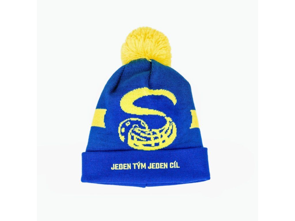 Zimní kulich v barvách pelhřimovského florbalu. Velký výplet "S" a heslo jeden tým - jeden cíl.
